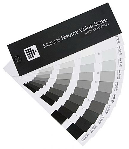 Fan 16,5 x 5 cm, color display 20 x 50 mm The Munsell Neutral Value scale is a graduation of neutral grey scale between absolutly black (0% reflectance) and absolutly white (100% reflectance).