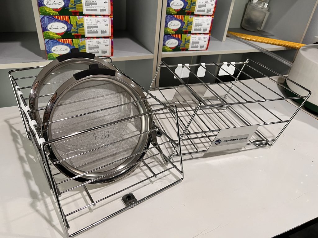 เพื่อความสดวก การใช้งานและการจัดเก็บที่เป็นระเบียบ ควรจะมี ชุดตระกร้าวางตะแกรงที่ออกแบบมาเพื่อใส่ กับ ตะแกรง Air jet sieves เท่านั้น Sieve Holder for  5 Alpine air jet sieves ช่องใ่ส่ตะแกรงแบบ 5 ช่องง